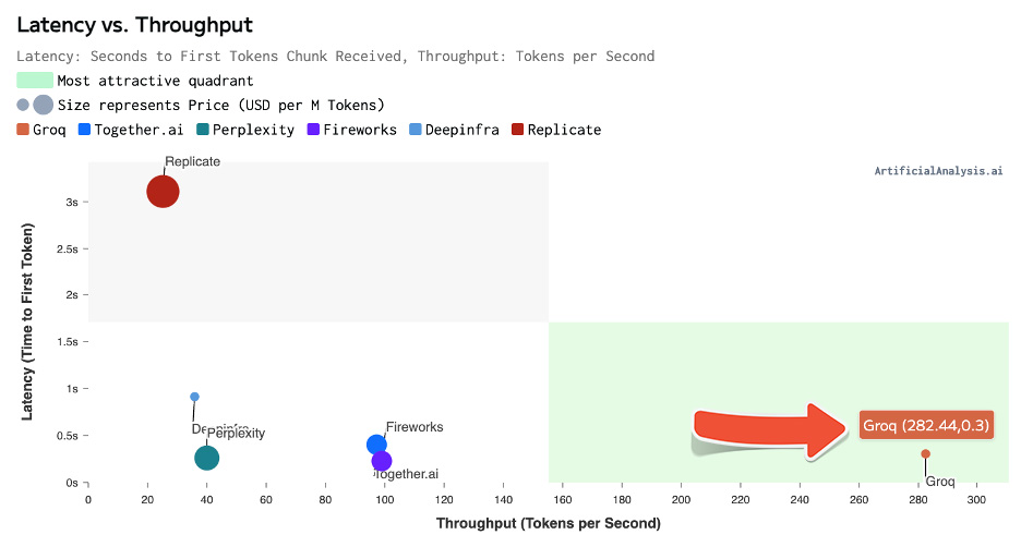 For latency, measured in seconds to first tokens chunk received, versus throughput, measured in tokens per second, Groq comes in at 0.3 seconds versus 282 tokens per second.