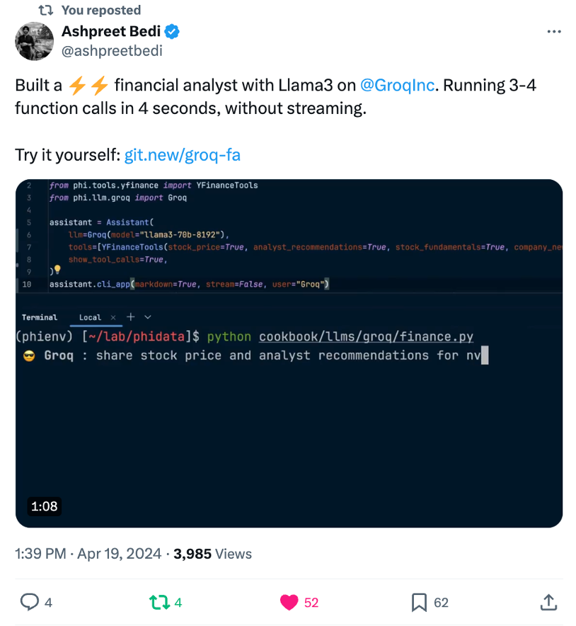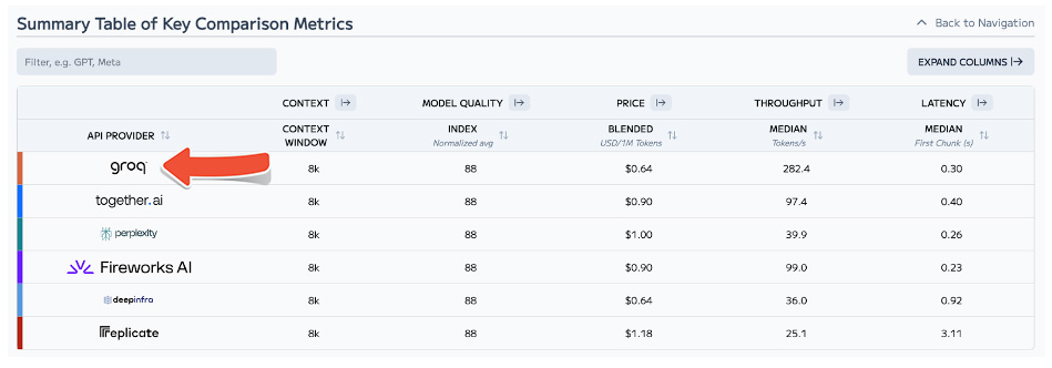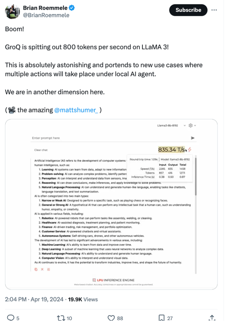 Artificial Analysis has independently benchmarked Groq as achieving a throughput of 877 tokens/s on Llama 3 8B and 284 tokens/s on Llama 3 70B, the highest of any provider by over 2X. Groq's offer is also cost competitive with both models priced at or below other providers. Combined with Llama 3's impressive quality, Groq's offer is compelling for a broad range of use-cases including emerging use-cases which demand a high number of interactions with LLMs such as AI agents.