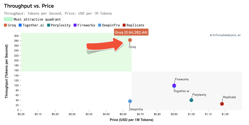 While ArtificialAnalysis.ai used a mixed price (input/output) of $0.64 per 1M tokens Groq currently offers Llama 3 70B at a price of $0.59 (input) and $0.79 (output) per 1M tokens.
