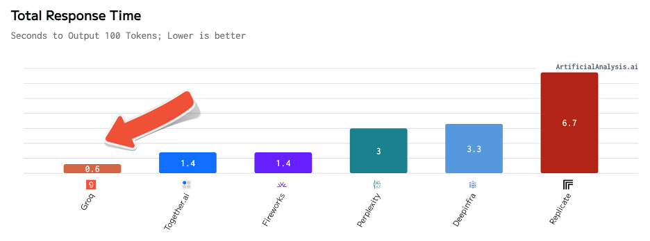 Measured as the time to receive 100 tokens output, calculated by latency and throughput metrics, Groq clocks in at 0.6 seconds.