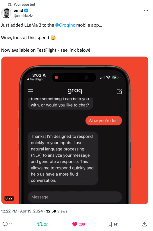 - April 19th, Midnight: Groq releases Llama 3 8B (8k) and 70B (4k, 8k) running on its LPU™ Inference Engine, available to the developer community via groq.humain.ai and the GroqCloud™ Console.