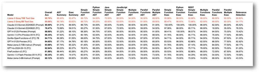 - Llama-3-Groq-70B-Tool-Use: 90.76% overall accuracy (#1 on BFCL at the time of publishing)